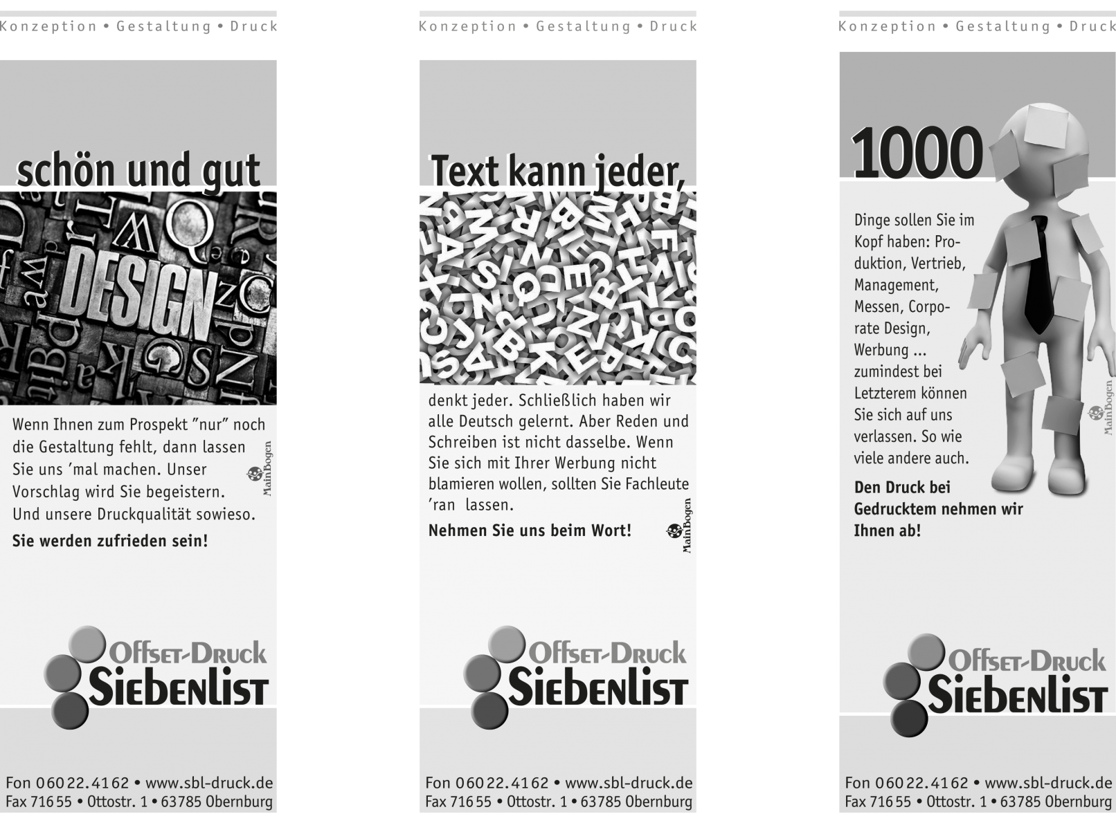 Ein kleines aber feines Unternehmen der Druckbranche, das sich durch hohe Arbeitsqualität und nicht zuletzt durch innovative Öffentlichkeitsarbeit im Markt der großen Internetdruckereien behauptet. In regelmäßigen Anzeigen wird vor allem die hohe Beratungsqualität und die Regionalität des Unternehmens kommuniziert.